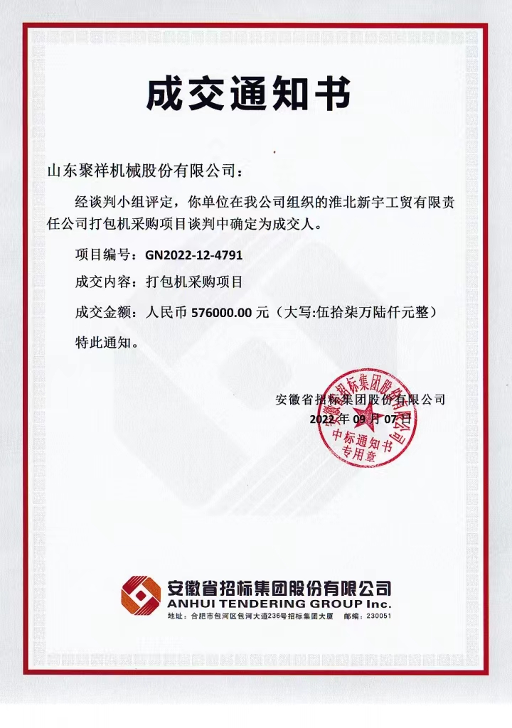 聚祥打包機招標成功